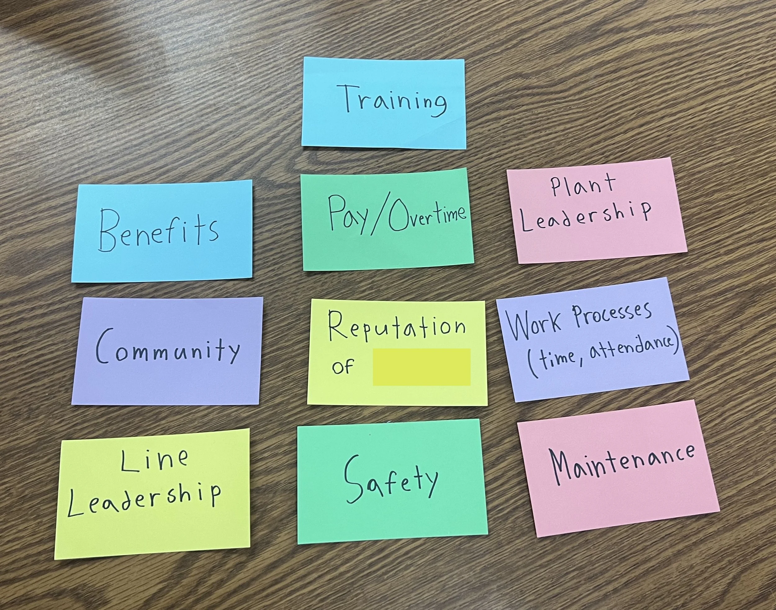 The focus groups were a bit more loosely structured, so our group sizes ranged from as small as 2 to as large as 7 participants. Participant roles ranged from HR, line managers, to plant leadership. During each focus group, we asked three main questions: