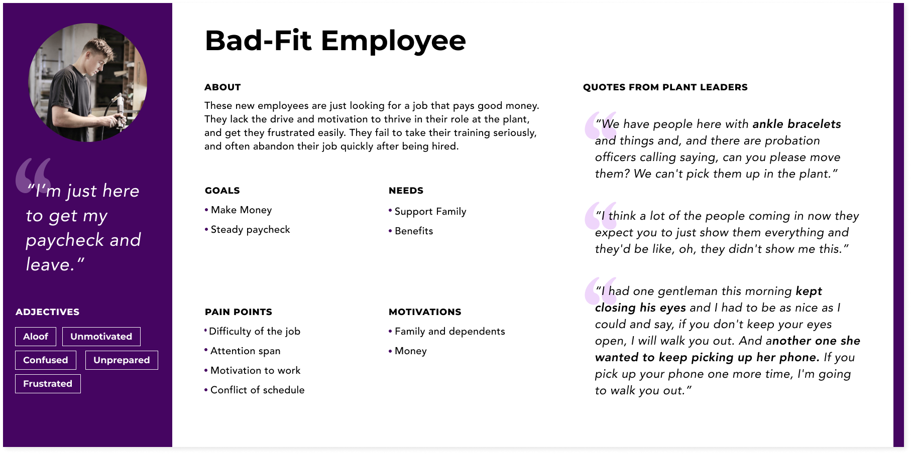We also used the data we collected to create our personas. We identified 3 distinct groups of 0-90 day employees that fit the following archetypes: